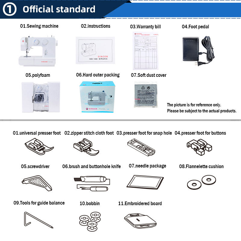 Highlights:9 automatic stitches800 stitches per minuteMotorised 70 watts2 needle positionsAutomatic bobbin winding4-step buttonholeEmbroidery featureZipper insertionTwin needle capabilityPush lever reverseStitch pattern indicatorStitch length control dialer (1409 upgraded feature)Accessories included: all purpose foot, zipper foot, buttonhole foot, button sewing foot, edge/quilting guide, darning plate, spool cap holders, screwdriver, bobbins, needles, lintbrush/seam ripper and oil bottle. Free sewing platform.Weight 6.5KgSize H38x W46.5 x L24.5 cmValue package with more practical accessories,welcome to buy our products.1 year warranty