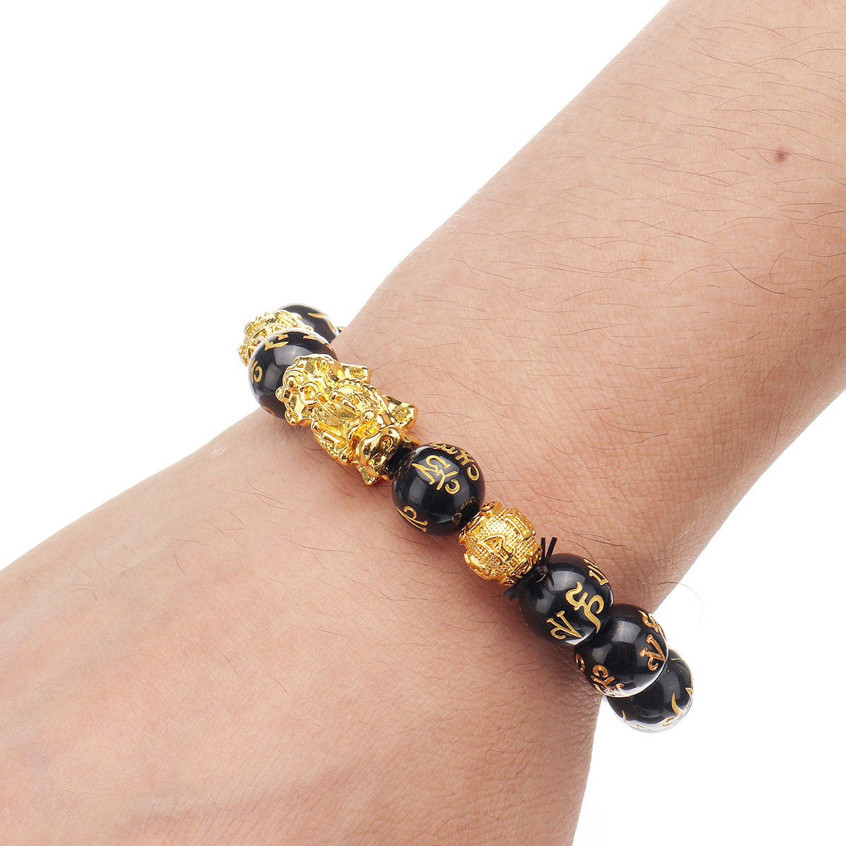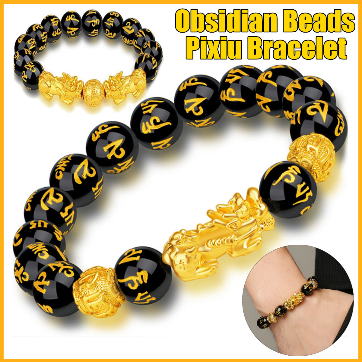 Buddhist Mantra Prayer Beads Pixiu Six Gold Word Bracelet Feng Shui Luck Obsidian Bangle
