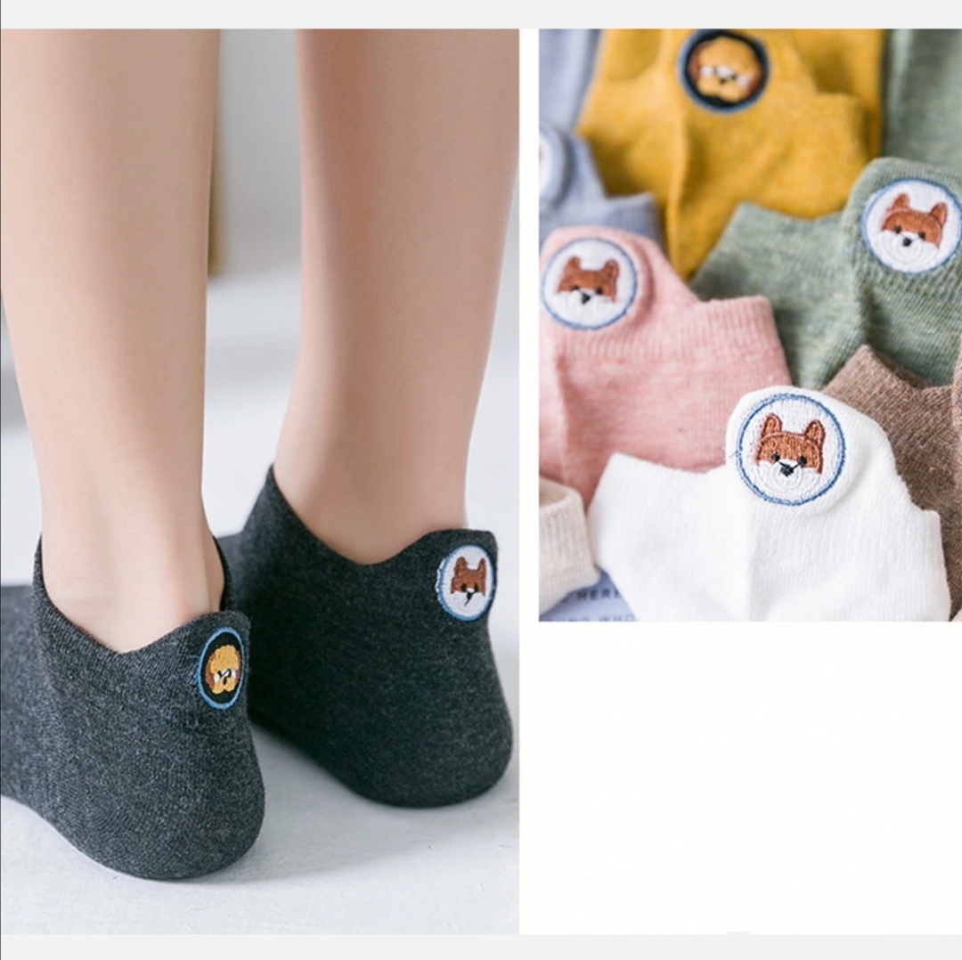 (SG Seller) Women Funny Ankle Socks Embroidered Animal Pug Cute Socks Kawaii Cartoon Candy Color Breathable Cotton Boat Socks