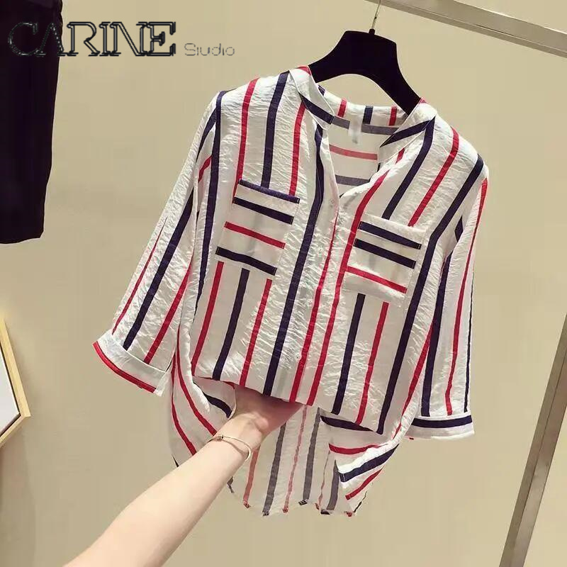 CARINE 2021 New Striped Korean Long sleeves Blouse Large size V collar Women Top