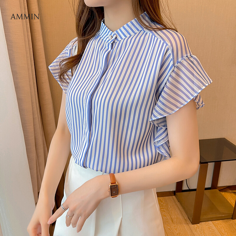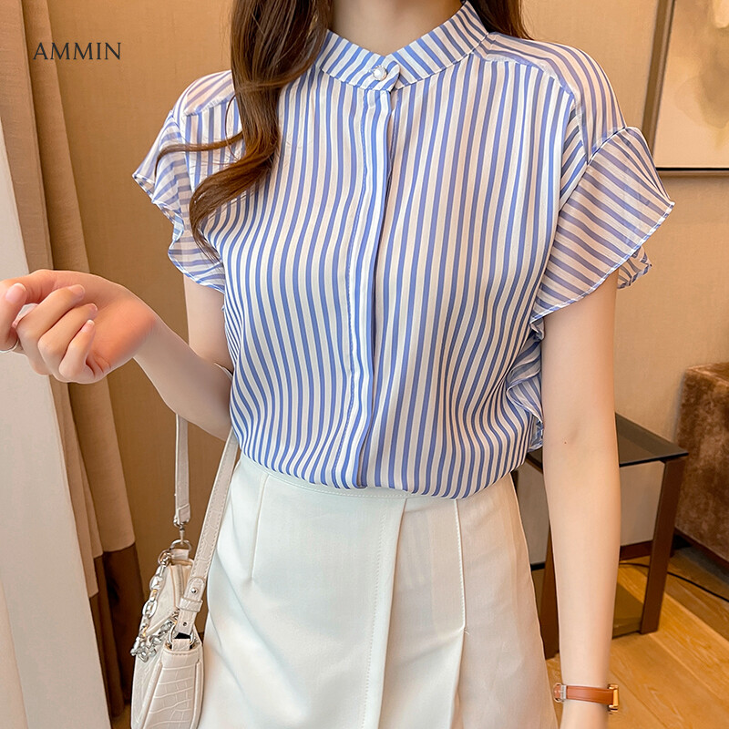 AMMIN Tops 2021 summer style stand-up collar striped ruffled sleeve chiffon shirt women's short-sleeved fine pearl button cardigan elegant blouse
