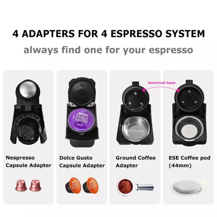 【 HiBREW espresso machine ST-514K (Multi-Capsule Espresso Coffee Machine) comes with 4 types of coffee adapters that can brew a variety of coffees as follows】;