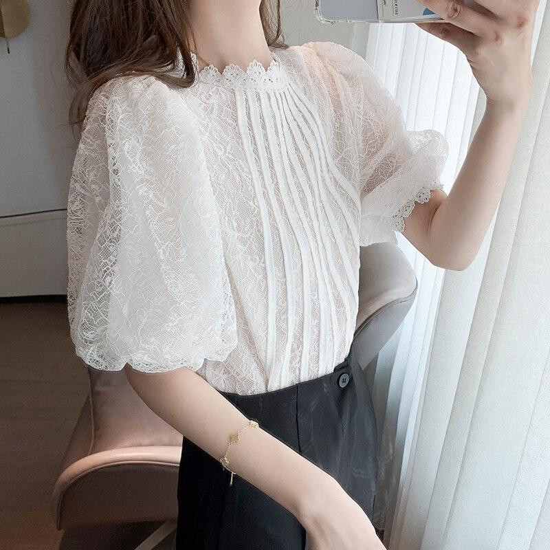 AFEG Korean style women's short-sleeved round neck lace blouse for women