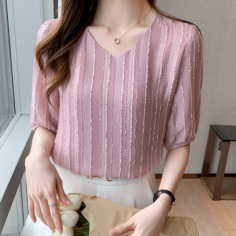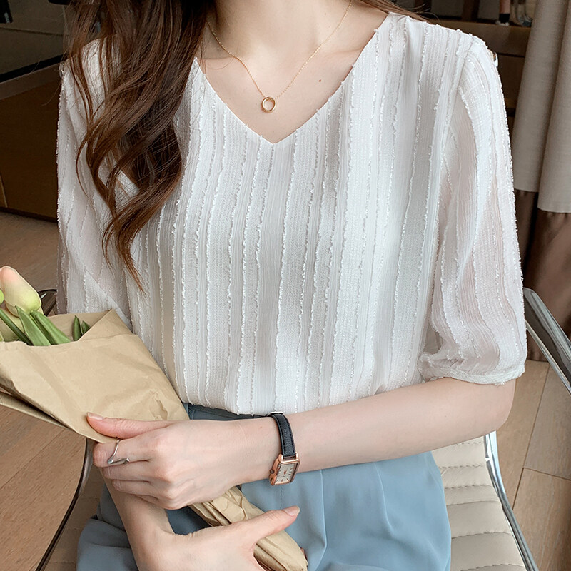 YIGE 2022 summer new jacquard V-neck blouse short-sleeved chiffon blouse fashion loose big size shirt