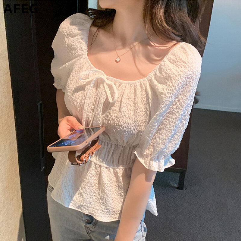 AFEG Korean style women's short-sleeved square neck tie temperament blouse for women
