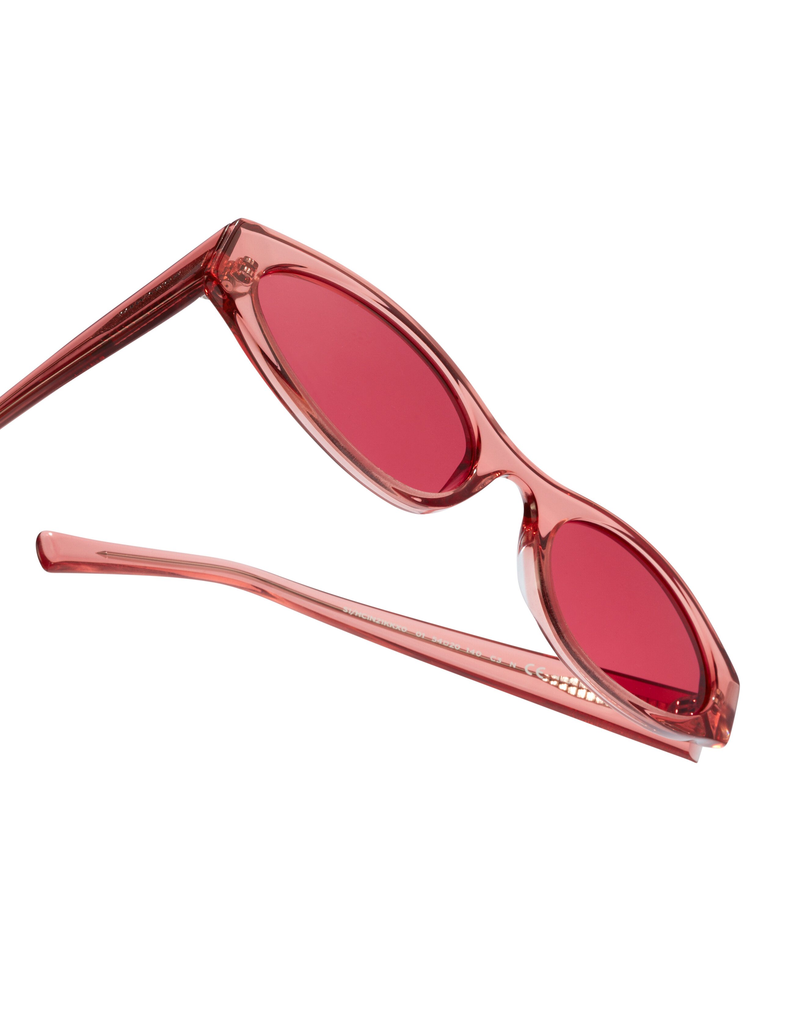 An abbreviated slim cat eye frame in bold, playful transparent pink acetate, with darker, cherry red lenses. Texturized detailing in the temple adds a subtle but eye-catching sparkle. Unisex model*Lenses of Eastman ?? TR18, one of the World leaders in copolyester technology. Respects the environment and gives a unique balance between clarity and resistance*Category 3 lenses*Antiglare protection*Frame made of biodegradable acetate.*Wider design of the earpiece for better ergonomics and comfort