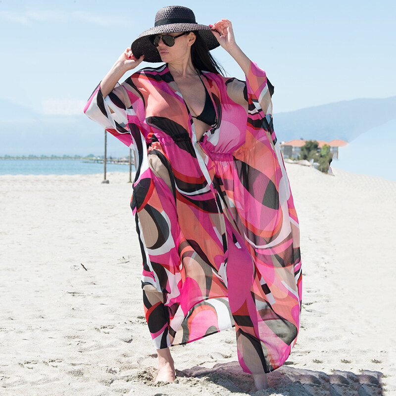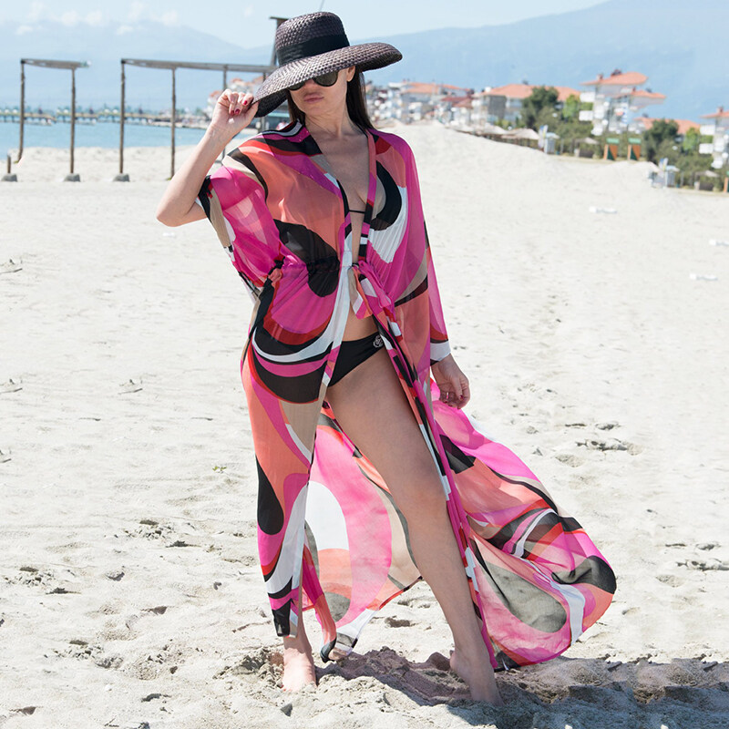 2023 Chiffon Printing Beach Cover Up Tunic Women Drawstring Beach Cardigans Colorful Maxi Dress Bikini Cover Ups