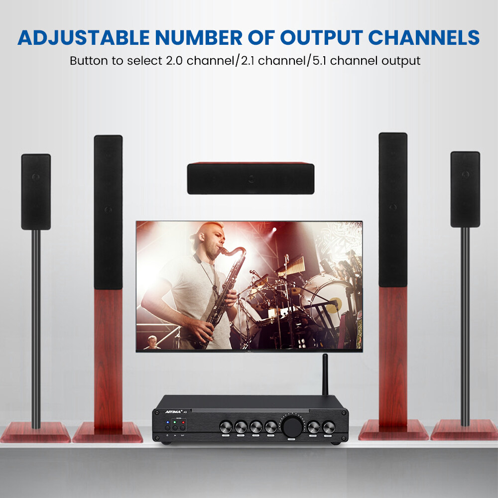 5.1 channel amp with professtional DSP decoding: A9 with built-in DSP decoding chip which applies professional algorithms and dynamic separation techniques, it auto allocates and simulates 2.1 and 5.1 channel and provide excellent smart noise reduction, precise sound positioning and stereo surrounded sense even though playing audio files of 2.0 channel.