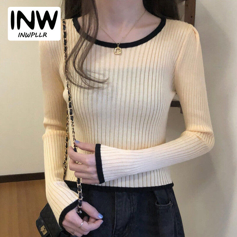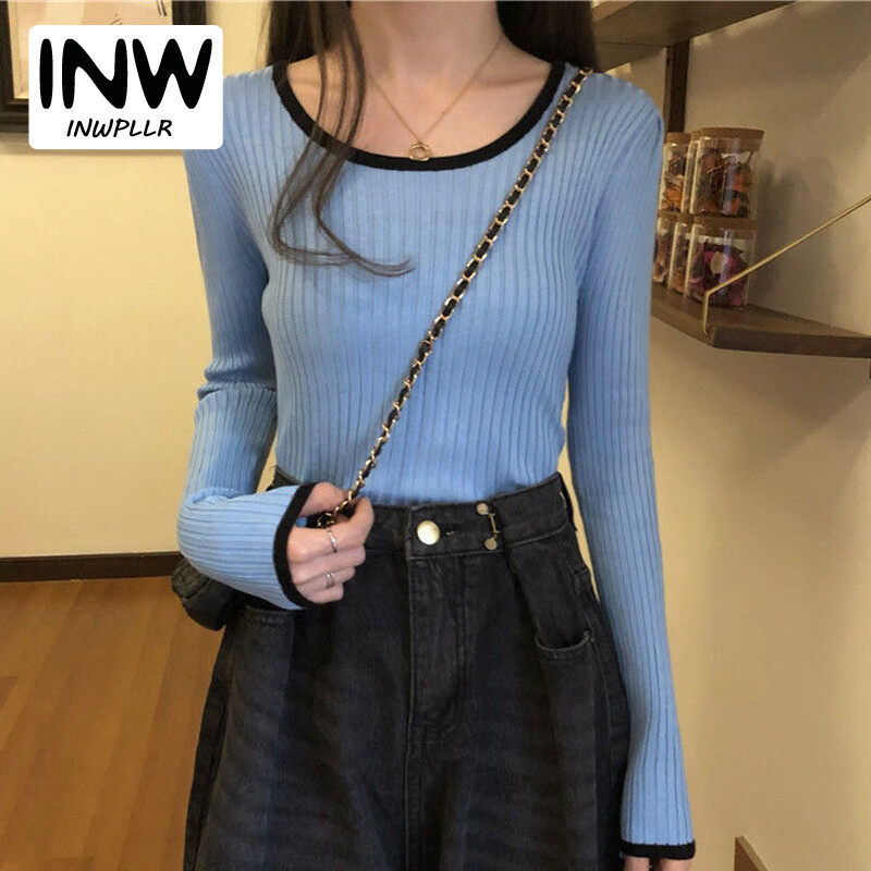 • INWPLLR Korean Style Women's Tshirts Solid Knitted Tops Tees Multi Colors Female Tops Casual O-Neck Long Sleeve T-shirts