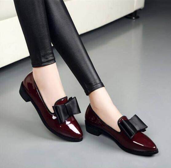 Ladies British Style Flat Pointed Patent Leather Bow Low Heel Small Leather Shoes