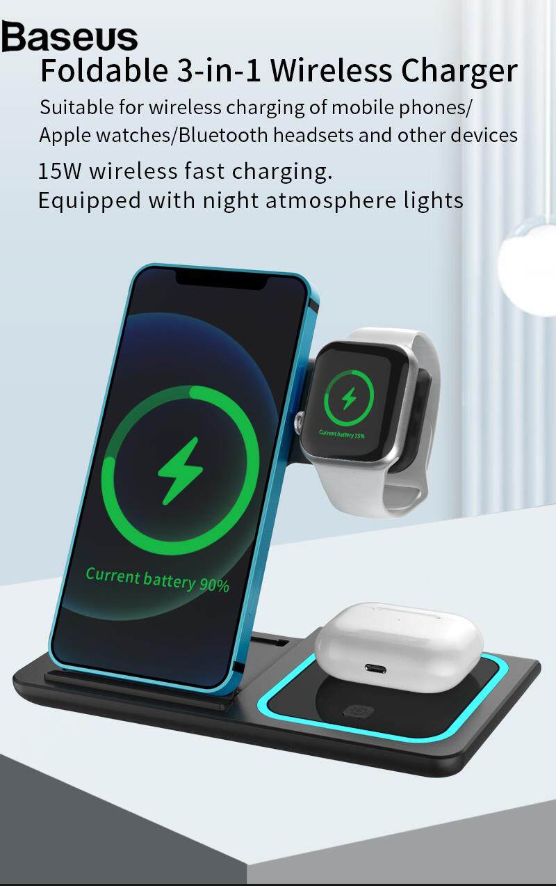Baseus X455 Foldable 3-in-1 15W Wireless Charger Desktop Qi Fast Charging Stand Dock for iPhone Android iWatch AirPods