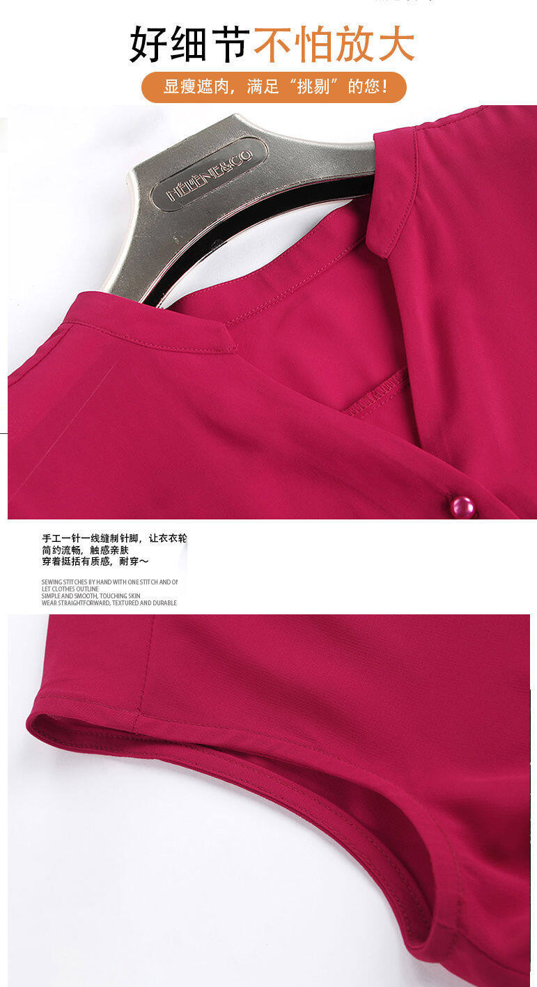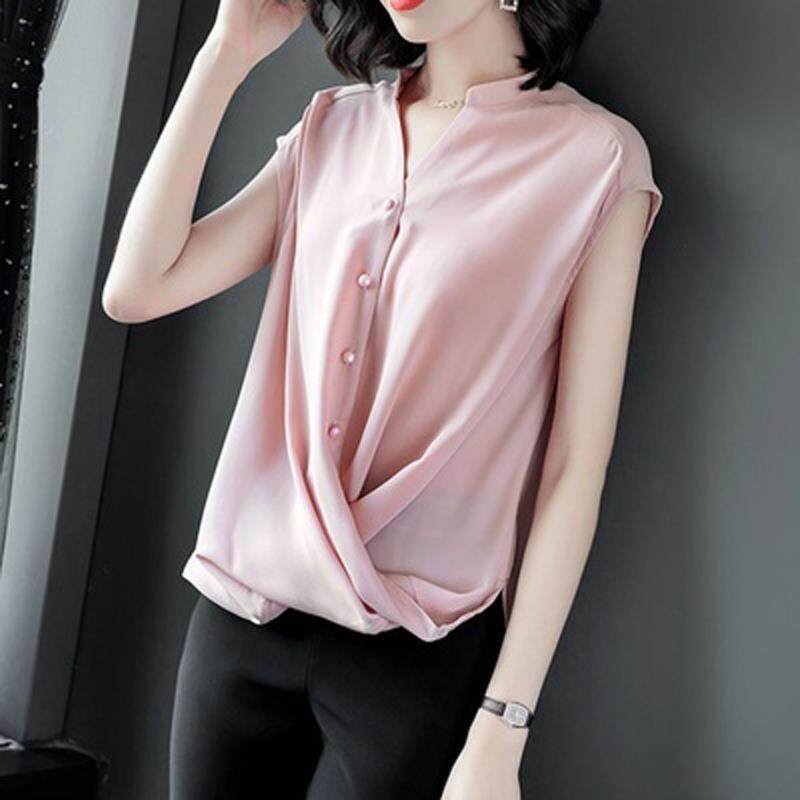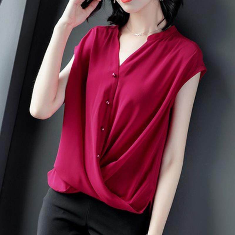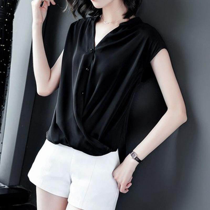 Blouse for Women Elegant Solid Loose Short Sleeve V-Neck Chiffon Tee Shirt Summer Clothes Office Ladies Plus Size Casual NEW Fashion Tops