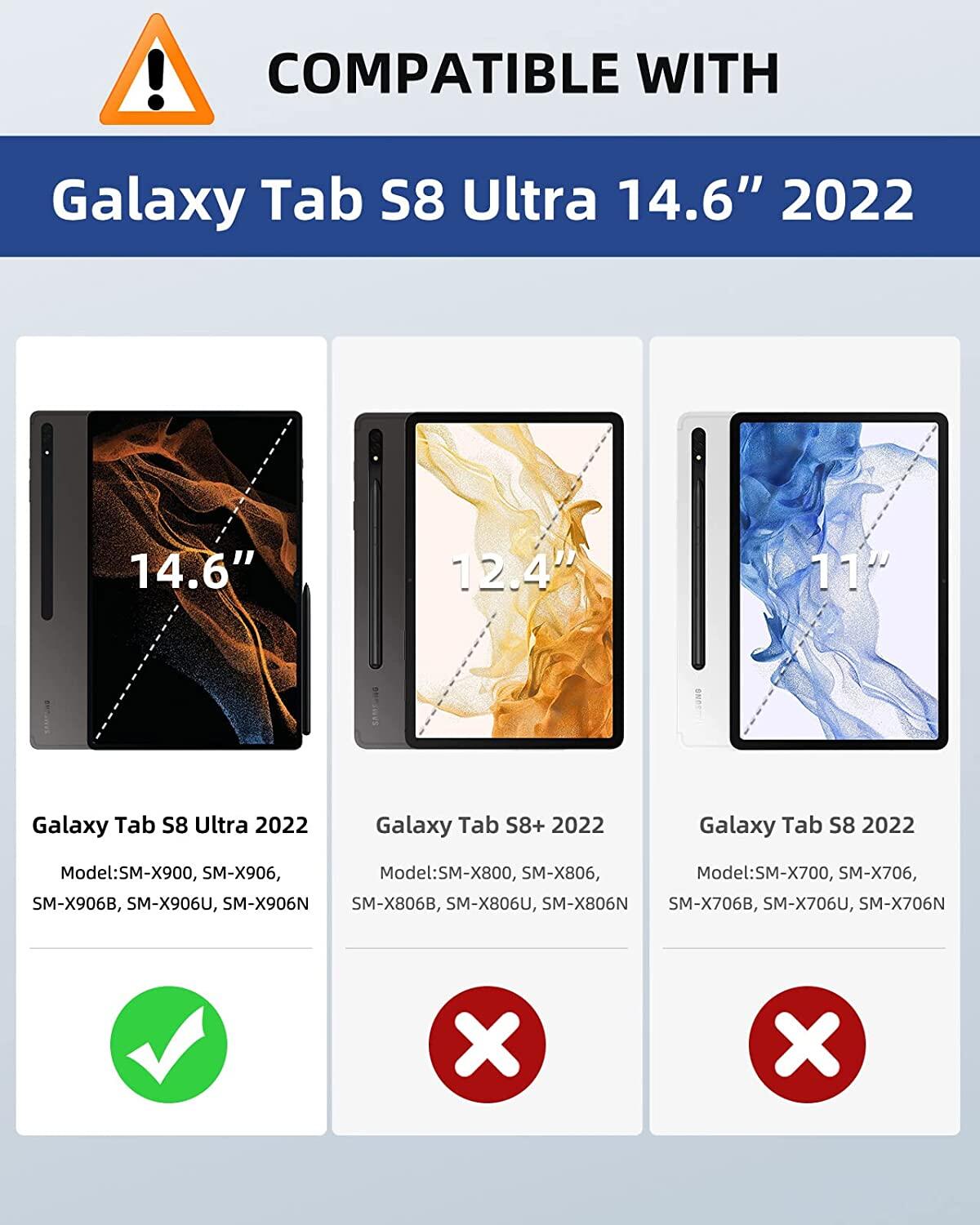 【Compatiblity】: Designed for Samsung Galaxy Tab S8 Ultra 14.6" 2022 (SM-X900/SM-X906/SM-X906B/SM-X906U/SM-X906N), only. Precise cutout allows you to get easy access to all buttons and ports.