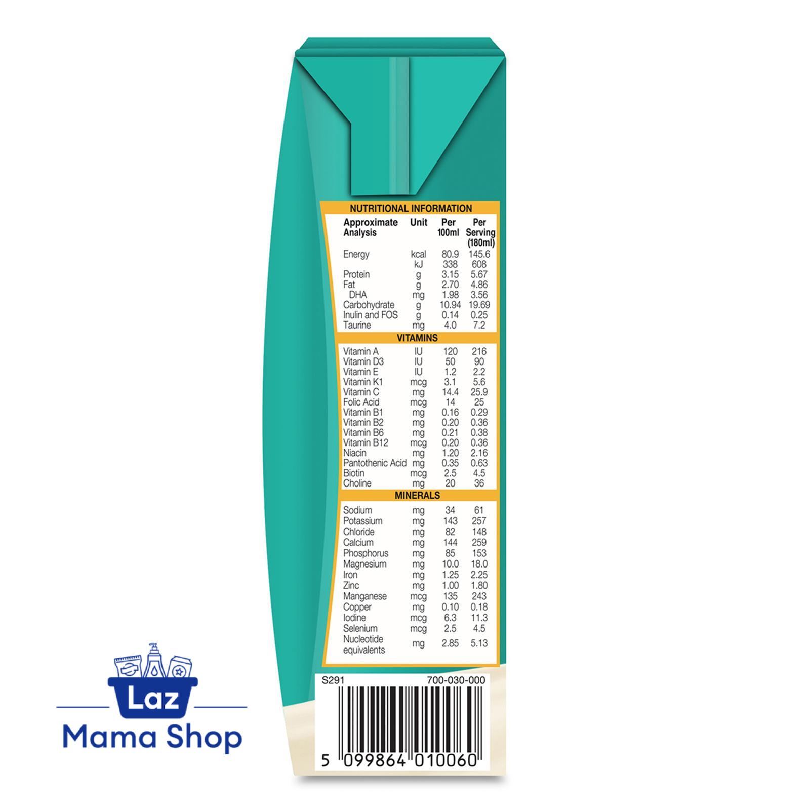 Water, whole milk solids, sucrose, skim milk solids, corn syrup solids, lactose, blend of inulin and fructooligosaccharides, MINERALS (calcium carbonate, potassium citrate, ferrous sulfate, zinc sulfate, manganese sulfate, copper sulfate, sodium selenate), cellulose gel, VITAMINS (sodium ascorbate, ascorbic acid, choline bitartrate, Vitamin E acetate, niacinamide, Vitamin D3, Vitamin A acetate, thiamin hydrochloride, pyridoxine hydrochloride, calcium pantothenate, riboflavin, folic acid, Vitamin K1, d-biotin), artificial flavor, cellulose gum, carrageenan, soy lecithin, gellan gum, taurine, docosahexaenoic acid (DHA) from C. cohnii. May contain potassium hydroxide.