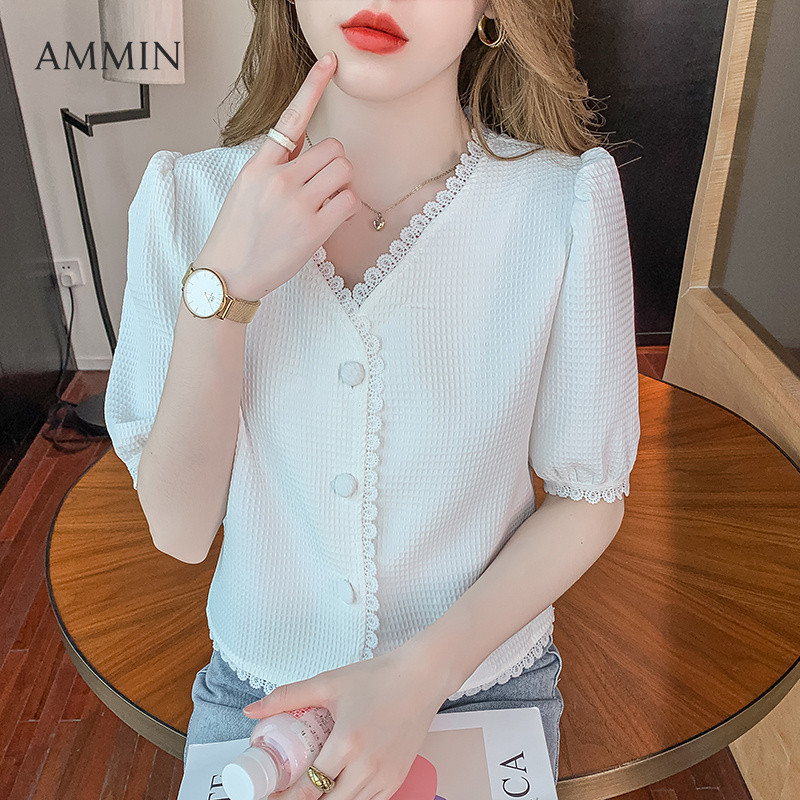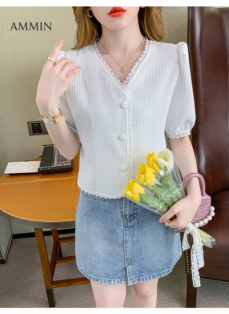 AMMIN Korean style ladies all-match elegant design sense waffle lace stitching short-sleeved Blouse fashionable temperament gentle style V-neck puff sleeve top