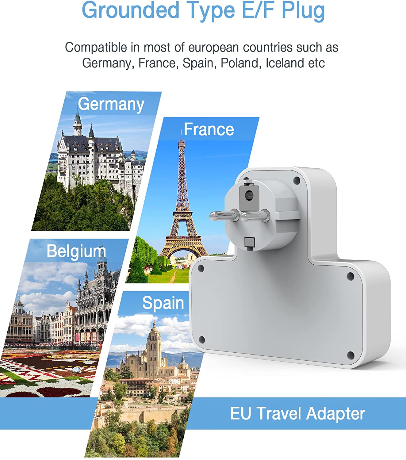 5 in 1 EU Travel Adapter UK Singapore to European Travel Plug Multi Sockets with 3 USB Charging Ports -2 Way AC Grounded Europe Travel Adaptor USB Charger Power Socket , Double Plug Adaptor UK to EU
