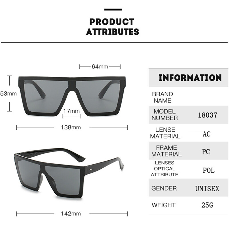 【Specification】 Product Name: Sunglasses Gender: Unisex Brand: PTQ Glasses Style: Square Glasses Structure: Full Frame Lens Material: AC Frame Material: PC Whether Polarized: No Visible Light Transmittance: 99% Glasses Color: 8 Colors To Choose From Glasses Weight: 30g Suitable For Face Shape: Various Face Shapes Applicable Scene: Sun Protection, Outdoor Sports, Driving Style: Fashion