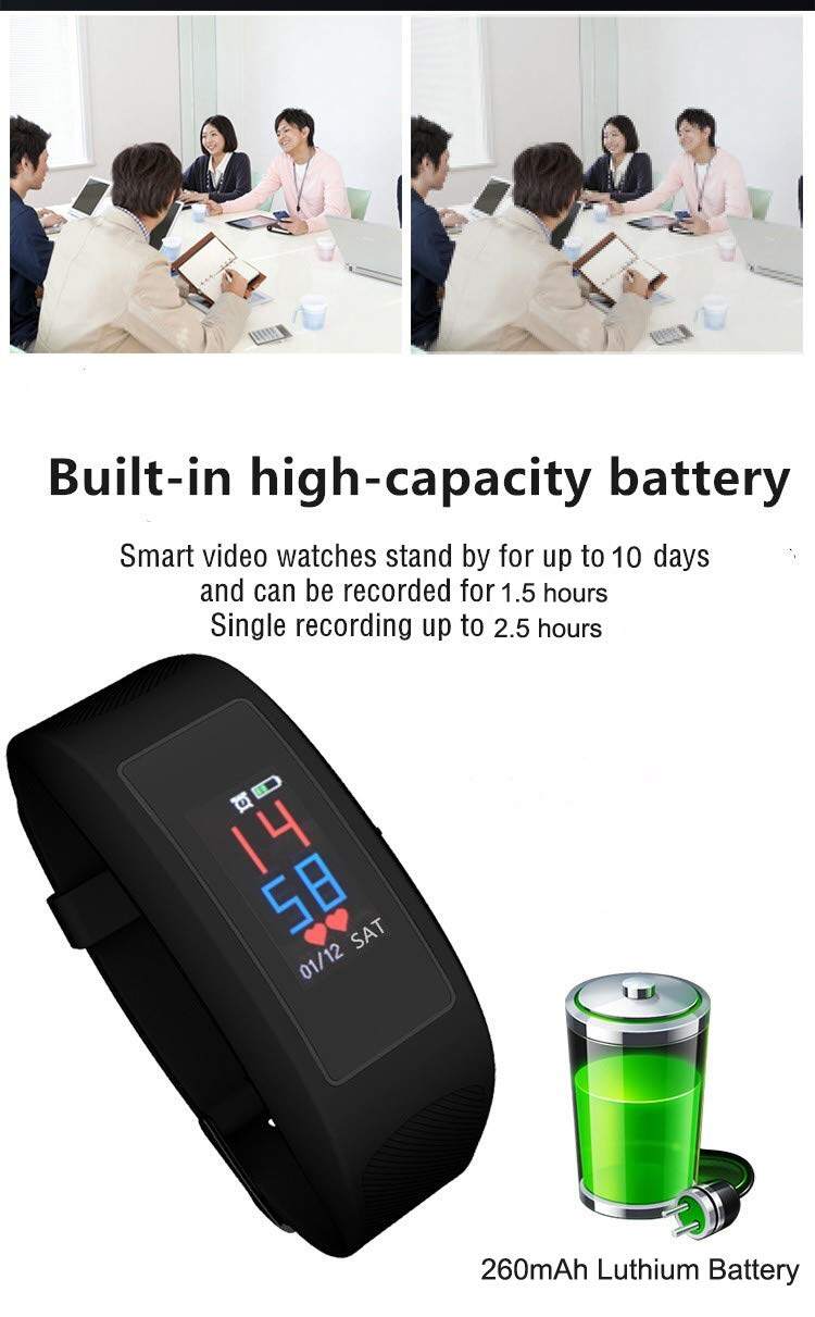 Battery for vedio recording 1.5 hours, battery for voice recording 3-4 hours. 32GB TF card can recod 4 hours 1080P vedio in .avi file.