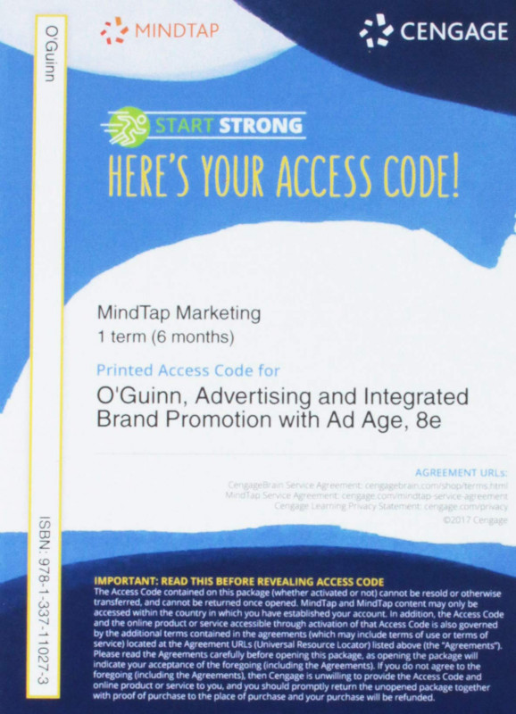 Students save money when purchasing bundled products. This bundle contains Advertising and Integrated Brand Promotion, 8th Edition, and access to MindTap Marketing for 1 term (6 months) via printed access card. With a single login for MindTap, you can connect with your instructor, organize coursework, and have access to a range of study tools, including e-book and apps all in one place! MindTap helps you learn on your terms. Read or listen to textbooks and study with the aid of instructor notifications, flashcards, and practice quizzes.