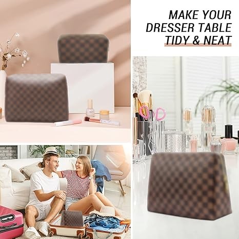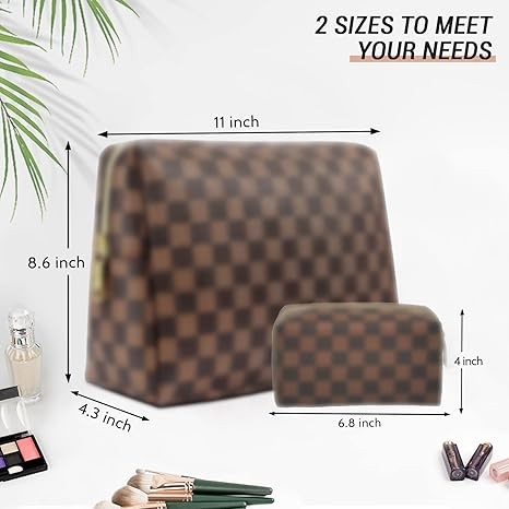 Checkered Cosmetic Bag, Portable Leather Cosmetic Bag, 2 Pieces Waterproof Travel Toiletry Bag for Women, Brown, Modern