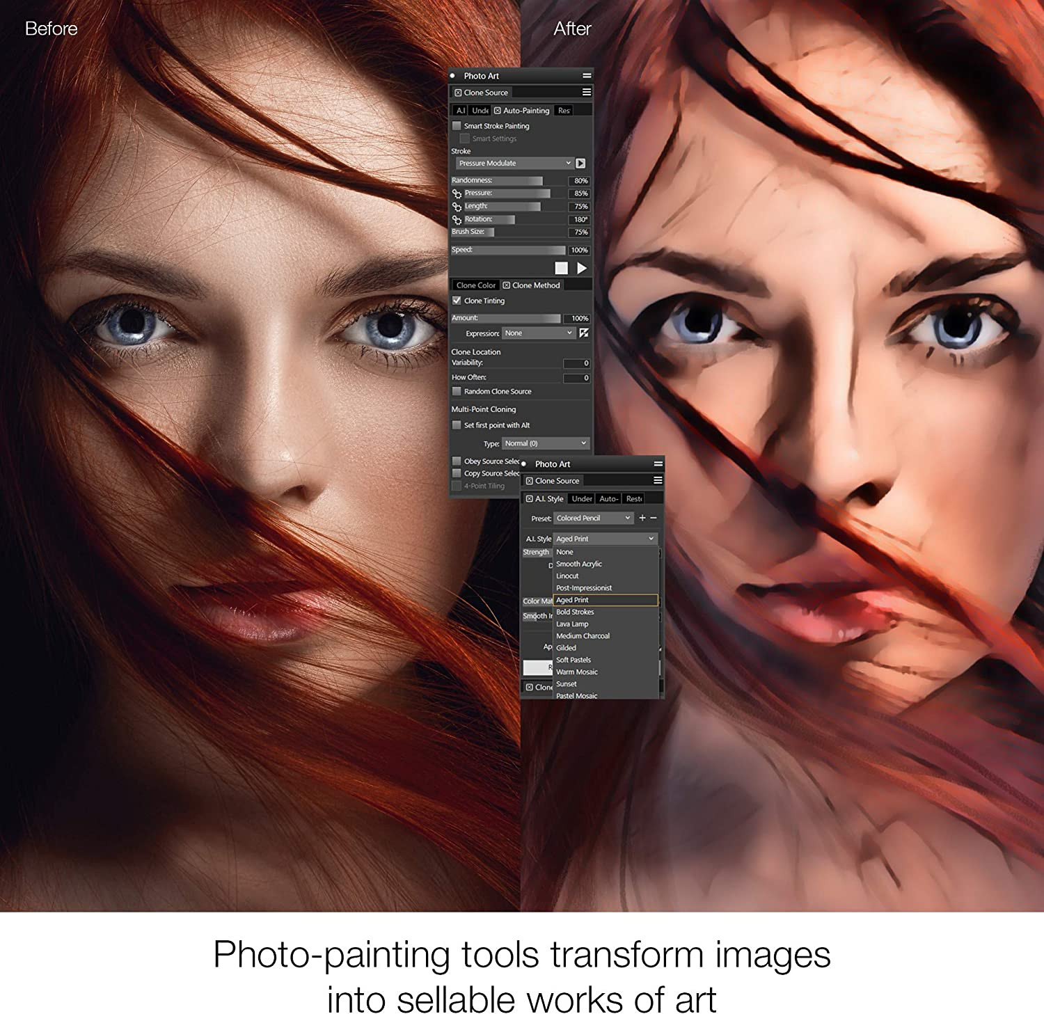 • Transform favorite photos and drawings into breathtaking paintings: stylize any image using artificial intelligence and easily transform imagery into paintings with powerful Auto-Painting and cloning tools