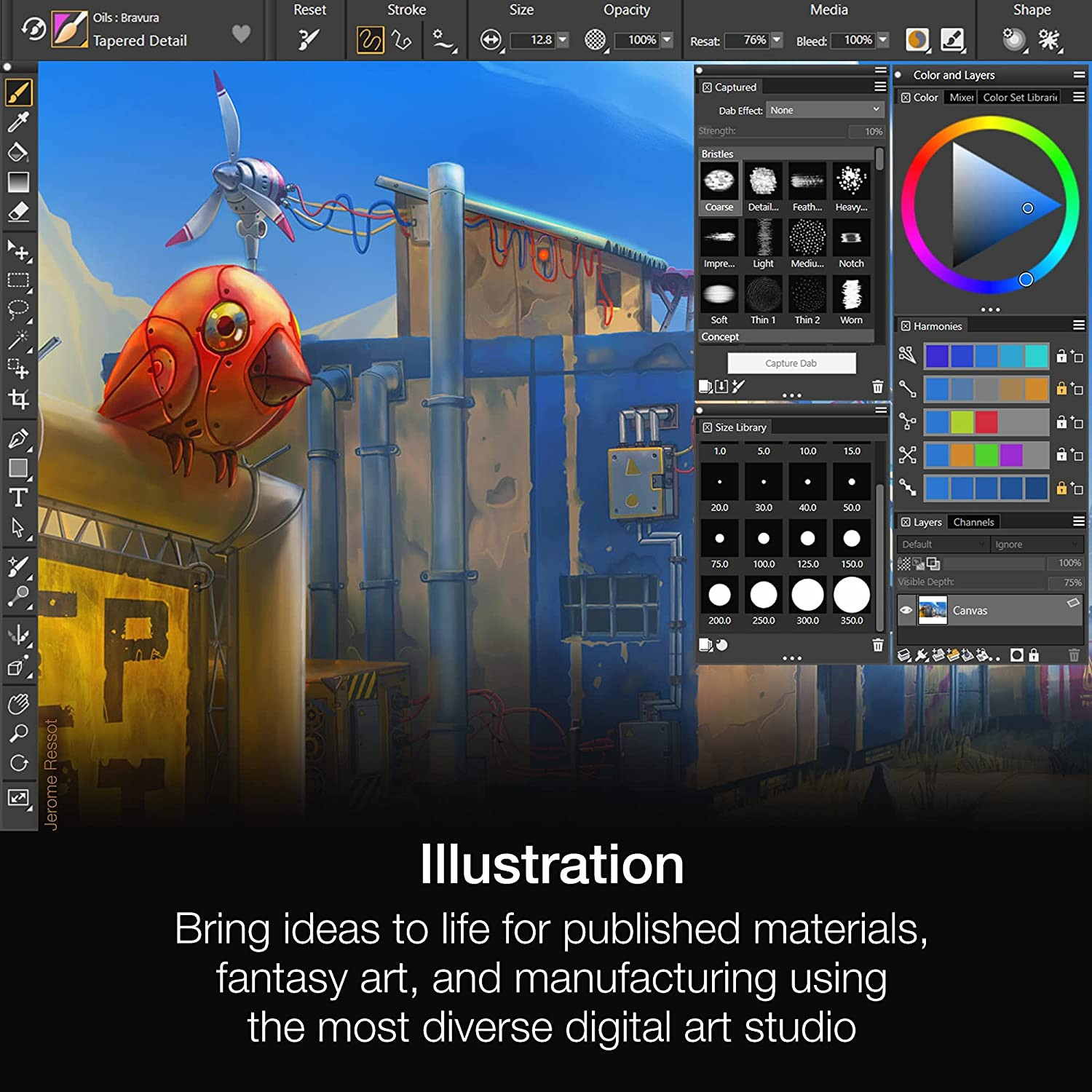 Craft your masterpiece with complete brush customization, canvas control, intuitive color mixing, composition tools, improved selection tools, easy content import, and preservation of files from Photoshop