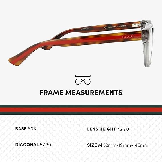 • Detailed Measurements: The Gucci GG0004ON features a diagonal of 57.3mm and lens height of 42.9mm, designed with a lens width of 53mm, bridge width of 19mm, and temple length of 145mm, offering a sleek and stylish fit that enhances visual comfort and clarity.