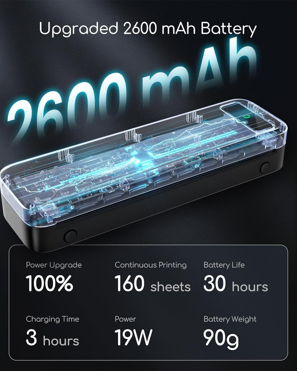 About This Product: Portable Printer for Wireless Travel [Compact and Space-Saving]: Weighing only 1.5 lbs, this portable printer measures a compact 10.39" x 3.07" x 1.77". This inkless portable printer easily fits in a backpack or briefcase! Perfect for mobile printing during business trips, in cars or trucks, in small offices, construction sites, schools, and at home. Print documents, contracts, invoices, receipts, and boarding passes anytime, anywhere.