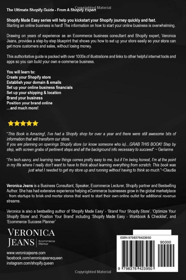 In Start Your Online Business, you’ll discover:The first book in the groundbreaking Shopify Made Easy 2023 series, Start Your Online Business is an eye-opening and sweeping game plan for taking your ecommerce venture to the next level. If you like self-determination, fast-action approaches, and crystal-clear explanations, then you’ll adore Veronica Jeans’ guide to victory.