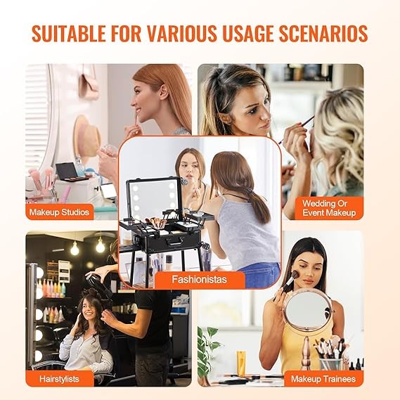 • Lightweight and Portable: The makeup case weighs only 24.9 pounds/11.3 kilograms and is equipped with an adjustable pull rod and 360° rotating large-size wheels, making it easy to carry. You can easily fit it in the trunk of your car or take it on a plane, making it your mobile makeup workstation.